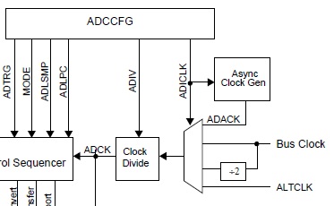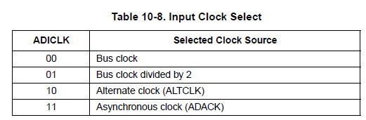 La segunda opción es tomar como fuente el mismo bus clock pero el módulo del ADC nos permite dividirlo por 2, 4 y 8 para variar la velocidad de conversión.