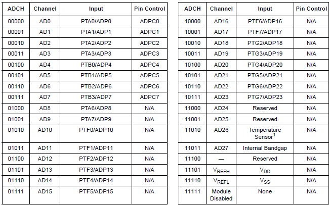 El ADC permite hacer las conversiones para cualquiera de los 24 canales entre AD0 y AD23. Si el registro que guarda el canal en el que se quiere trabajar ADCSC1_ADCH(4:0) es igual a 11111, entonces el subsistema que se encarga de convertir será apagado.