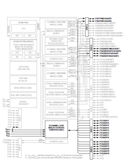 El módulo ADC del microcontrolador Freescale MC9S08QE128 cuenta con 24 canales de conversión cada uno a 12bits de resolución. La lista completa de pines asignados para cada canal se describe en el Manual de Referencia Archivo:MC9S08QE128RM Reference Manual.pdfy en la tabla a continuación.