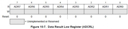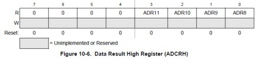 Si se trabaja con el modo de operación de 8bit los bits 0, 1, 2 y 3 del registro ADCRH serán iguales a cero. Si se trabaja con el modo de 10bits, los bits 2 y 3 del ADCRH serán iguales a cero. En caso de cambiar el modo de operación, cualquier dato guardado en ADCRH será borrado
