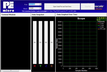 Para inicializar es necesario indicarle al programa a cuanto se desea transmitir la opción dependerá del usuario sin embargo el estandar es 115000, y el puerto por lo general es el usb, sín embargo pueden usarse puertos de comunicaciones (COM1:COM5)si el usuario asi lo desea. Verificar previamente la correcta configuración de los jumpers y mantener apagado el DEMOQE, luego cuando se hace la compilación correcta del programa y se hace el debug correspondiente, se puede abrir el puerto en la aplicación pulsando el boton "Open serial port and start demo".