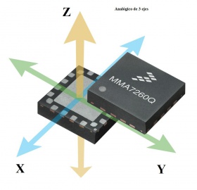 Este dispositivo de bajo costo (MMA7260Q[3]) está presente solo en la primera revisión del DEMOQE (Rev A),en este acelerómetro analógico tenemos las coordenadas x,y,z y cuyos voltajes serán proporcionales a la aceleración a la que se someta el dispositivo. Las señales en cada uno de los ejes son convertidas en el ADC antes de enviarse vía serial a través del puerto de comunicaciones y ser visualizado en el TOOLKIT PC APPLICATIONS - DEMOQE128, el usuario puede realizar ciertas modificaciones referente al rango de gravedad/sensibilidad sobre el dispositivo según lo demande la situación. Las distintas modalidades pueden observarse en el marco de configuración.[4]