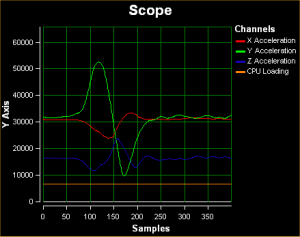 - Scope: Muestra el trazado de las señales que van cambiando en el acelerómetro a medida que experimenta variaciones de posición, si el movimiento es brusco, los valores de muestra seran altos y viceversa si sucede lo contrario, el graficador toma el trazado de todos los ejes al mismo tiempo.