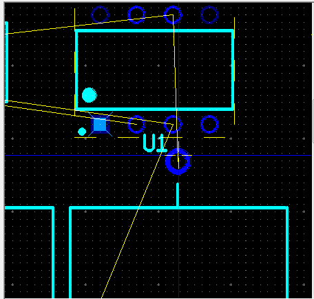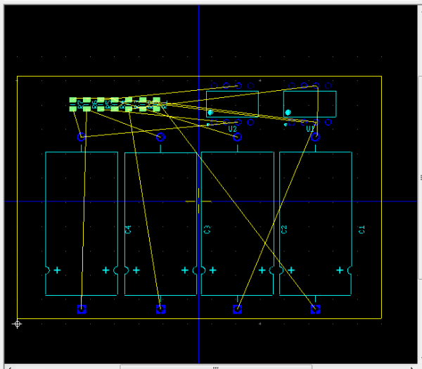 Lo que vemos ahora en la pantalla de Ultiboard son las huellas de los componentes que conforman el diseño, una serie de líneas que conectan las terminales de los componentes (conocidas como ratnets), y una tarjeta rectangular predeterminada. Igual que en Multisim podemos utilizar la rueda del mouse para acercanos/alejarnos en el espacio de trabajo.