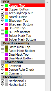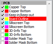 En la figura anterior podemos ver que tenemos dos capas de cobre en esta tarjeta, en la parte superior e inferior (Copper Top y Copper Bottom); tenemos también las capas de Serigrafía Superior e Inferior (es en estas capas donde van las imágenes de los componentes con su identificación); la capa Contorno de Tarjeta es donde podemos controlar el tamaño y la forma de nuestra tarjeta. Todas las capas las podemos habilitar y deshabilitar, es decir, si no queremos ver el contorno de la tarjeta solo basta con dar un clic en la caja donde está la ‘palomita’ y esta capa se podrá en un color gris, dando una vez mas clic desaparecerá el contorno de la tarjeta. Todo esto es útil cuando nuestro diseño va creciendo y tenemos nuestros componentes, pistas de cobre, etc., pero sólo nos interesa trabajar en una capa en particular.