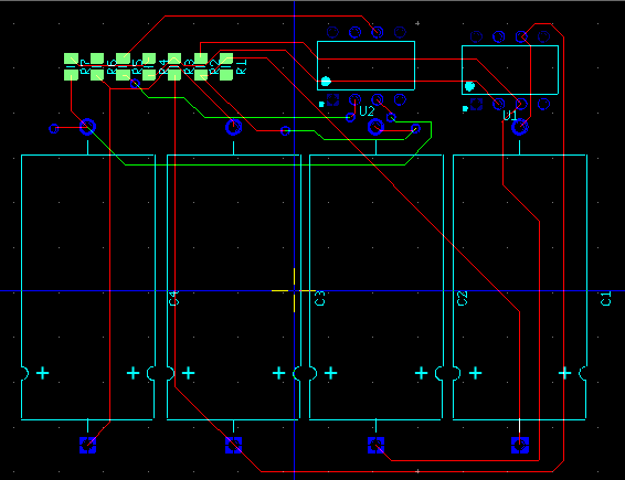 En esta tarjeta vamos a crear las pistas en la capa inferior. En la ventana Herramientas de Diseño demos doble clic sobre Copper Bottom para activar esta capa. También, en la barra de filtros desactivemos todo a excepción de Habilitar Selección de Pistas. Ahora vamos al menú Colocar>>Línea / Place>>Line y utilicemos la rueda del mouse para acercarnos a los componentes. Por ejemplo, en la siguiente figura voy a crear la pista para conectar los componentes U1 y C1:
