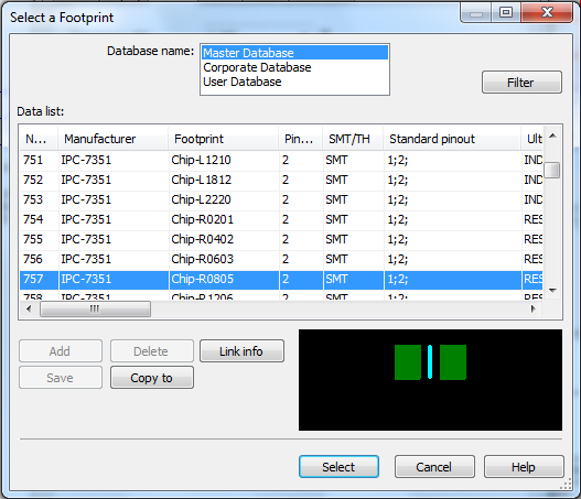 Antes de transferir el diseño a Ultiboard debemos asegurarnos de que todos los componentes (resistores, capacitores, etc) cuentan con la información de huella (footprint). La huella no es más que la representación gráfica del componente real. Es decir, debe tener las dimensiones exactas que tendrá el componente real. Veamos como ejemplo la huella del componente R1. Da doble clic sobre el componente R1 para abrir sus propiedades, después selecciona la pestaña Valor(Value). En la parte inferior de la ventana encontrarás la Configuración de diseño(Layout Settings); ahí podemos ver que R1 tiene asignada la huella Chip-R0805 (esta es una codificación que indica los detalles de la huella). Ahora da clic en Editar huella(Edit Footprint)… después en Seleccionar de Base de Datos(Select From Database). Se abrirá la Base de Datos Maestra(Master Database) y verás la visualización de dicha huella: