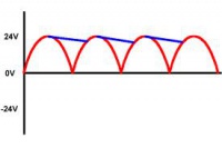 Filtrado: Como la etapa de rectificación no elimina la forma AC de la señal entrante, es necesaria una etapa de filtrado, esta suele estar conformada por capacitores que se encargaran de esta tarea. Los capacitores, se cargan al valor máximo que entrega la etapa de rectificación, así, cuando baja la tensión, estos se descargaran lentamente cuando la tensión baje y se cargara nuevamente cuando vuelva subir, logrando una señal lo más similar a una señal DC. Hay que tomar en cuenta, que es muy difícil eliminar del todo la componente AC, quedando siempre un residuo conocido como riple o rizado. A mayor eliminación de riple más compleja será la etapa de filtrado.