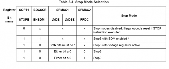 Existen tres modos de operación en STOP, siempre y cuando el bit STOPE del registro SOPT1 se encuentre en “1”. El bit WAITE del registro SOPT1 deberá ser aclarado, excepto cuando se desee trabajar en modo WAIT. En el modo STOP3 las fuentes de reloj de la CPU son interrumpidas. Los diferentes modos de STOP son seleccionados mediante el bit PPDC del registro SPMSC2. La mayoría de los comandos del modo background (BDM) no son reconocidos en los modos de STOP, pero el comando BACKGROUND puede sacar la CPU del modo STOP4 y entrar en modo HALT. Quedando la CPU en el modo HALT y estando el bit ENBDM en “1”, todos los comandos del BDM se podrán utilizar.