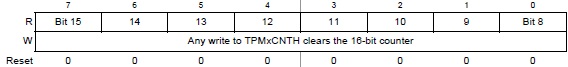 Los registros TPMxCNTH y TPMxCNTL contienen el bit más significativo y menos significativo respectivamente del valor en el contador del TPM. Leer cualquiera de los valores en estos registros coloca los datos de ambos en un buffer hasta que se finalice esta operación. Estos registros se resetean apenas se resetee el Microcontrolador o se escriba en el registro TPMxSC. Como ambos son registros de solo lectura, apenas se intente escribir en alguno de ellos se reseteara el contador.
