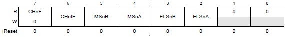 - CHnF (Bit 7): Cuando el canal esta en el modo de captura de entrada, este bit se pondrá en uno cuando ocurra el flanco que se definió como flanco activo. Cuando el canal esta en comparación de salida, en alineación de flancos o alineación central de PWM, el bit CHnF se coloca en uno cuando el valor en el registro del contador es igual al valor en el registro del canal, siempre y cuando el duty cycle no sea ni cero ni cien porciento. La interrupción ocurrirá siempre y cuando este bit este en uno y que las interrupciones estén habilitadas, es decir que el bit CHnIE sea uno. Resetear coloca el bit CHnF en cero.