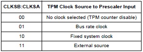 - CLKS[B:A] (Bit 4:3): Estos dos bits se usan para definir que tipo de clock se va a utilizar. El clock fijo solo sirve cuando el clock del sistema esta basado en un sistema PLL (divisor del clock). En caso de no ser así el clock va a ser el mismo que el bus clock, 1MHz para este caso. La sincronización de un clock externo se genera mediante el modulo del bus clock del TPM, mientras que para el caso de un clock fijo es a través de un circuito sincronizador.