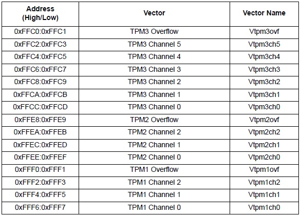La operación que va a ocurrir por una interrupción del tipo TOF varía dependiendo del modo de operación en que se encuentre el canal TPM, sin embargo las variaciones son mínimas. Para las interrupciones del tipo TOF normales ocurren apenas el contador cambia de 0xFFFF a 0x0000. Cuando el TPM no esta configurado para alineación central de PWM, la bandera se coloca en uno cuando el contador cambia del valor que esta en el registro de modulo a 0x0000.
