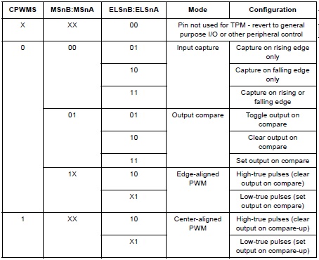 Los canales pueden ser configurados independientemente como capturadores de entrada, comparador de salidas, o alineación de los flancos de PWM. Un bit de control puede modificarse para que todos los canales del módulo sean configurados como alineación de la modulación del ancho de pulso, si este es el caso se inhabilitan las otras opciones de configuración. Cuando el Microcontrolador esta en BDM background o BDM foreground, el TPM suspende las operaciones y las reanuda apenas el microcontrolador regresa a estado normal. Cuando esta en stop, todos los clocks del Microcontrolador se paran, incluyendo el oscilador principal, por lo tanto el modulo TPM es inhabilitado momentáneamente. En el modo de espera (wait mode), el TPM opera de forma normal ya que no genera una referencia a tiempo real ni el interrupt necesario para despertar el micro de este estado. Los modos de operación son los siguientes: