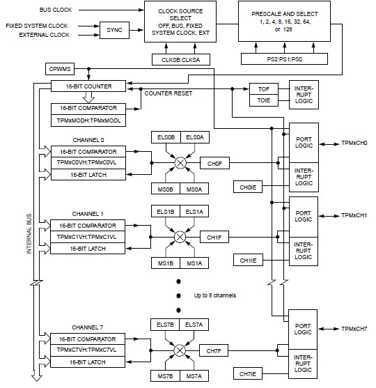 El módulo TPM usa un pin de entrada/salida por canal (TPMxCHn), donde n representa el numero del canal. Hay que tener cuidado a usar estos pines ya que los pines de entrada/salida del TPM están asociados a los puertos de entrada/salida generales del microcontrolador. El componente central es el contador de 16 bits, el cual provee el tiempo de referencia para los modos de operación. Los registros del modulo del contador (TPMxMODH:TPMxMODL) registra el valor del modulo. Este dato se puede leer cuando sea, mas si se modifica este dato en la parte baja (TPMxMODL) o en la parte alta (TPMxMODH), se resetea el contador.