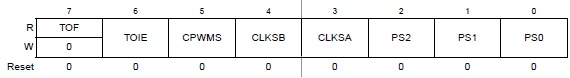 - TOF (Bit 7): Este bit se conoce como la bandera de overflow del timer. Este bit se coloca en uno cuando el contador del TPM se resetea (0x0000) luego de haber alcanzado el valor guardado en el registro de modulo del contador. Para borrar este bit (ponerlo en cero), es necesario leer el registro TPMxSC cuando la bandera este en uno y escribir en este bit un cero. Si llegase a ocurrir otro overflow antes de colocar el bit 7 en cero, la secuencia se resetea por lo tanto la bandera quedaría en uno para que una interrupción del tipo TOF no se pierda debido a una anterior.