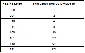 - PS[2:0] (Bit 2:0): Estos 3 bits se usan para modificar el clock del TPM escogiendo uno de los factores de división que se observan en la siguiente tabla.