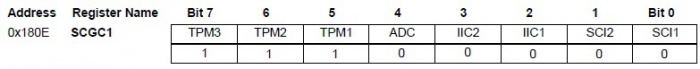 Los clocks de los módulos TPM1, TPM2 y TPM3 pueden activarse o desactivarse usando el módulo SCGC1 [TPMx]. Cuando los bits están en 1, los puertos se habilitan dejando usar los clocks de cada módulo, y en cero se inhabilitan. Luego de un reset estos bits se colocan en 1.