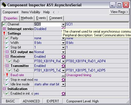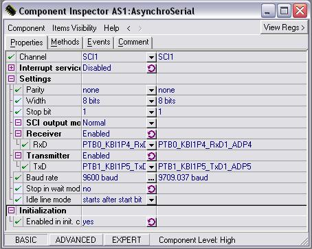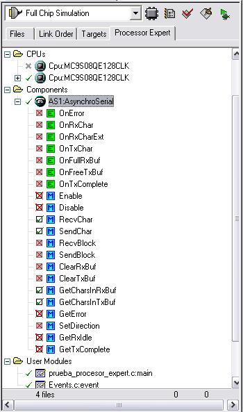 Ya que añadimos el puerto serial al proyecto lo tenemos del lado izquierdo de CodeWarrior junto a nuestros archivos y dispositivos, si le damos al botón “+” alado del componente se expande una serie de funciones relevantes a este dispositivo. Algunas de estas funciones se encuentran deshabilitadas debido a la configuración que tenemos del dispositivo, pero si colocamos el ratón encima de cada función obtenemos una breve descripción de que hace y como lo hace.
