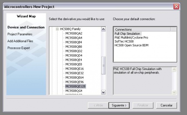 • Luego buscamos en la lista el microprocesador que vamos a utilizar: para este ejemplo utilizaremos el MC9S08QE128