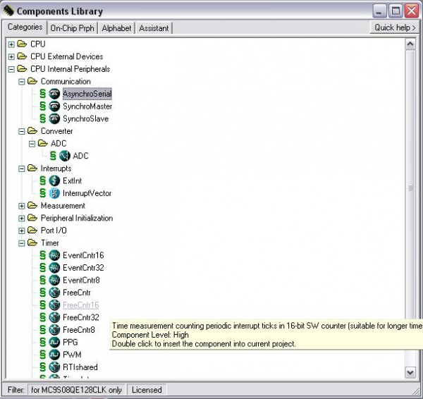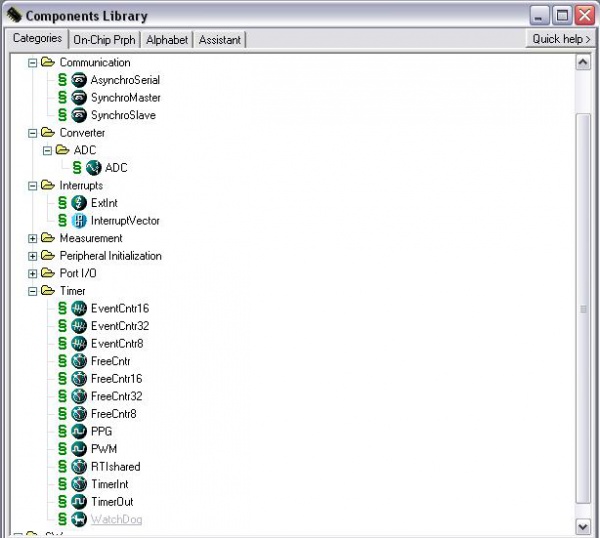 Abrimos la ventana de biblioteca de componentes, y encontramos varias carpetas, la primera CPU contiene otros microprocesadores, la segunda CPU external devices contiene dispositivos para comunicarse con otros módulos o microprocesadores por medio de el protocolo SPI. La tercera carpeta CPU internal peripherals contiene una gran gama de dispositivos para usar. Para este ejemplo vamos a añadir un puerto serial, abrimos la subcarpeta Communication y escogemos un puerto AsyncroSerial.