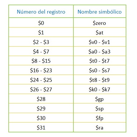 Existen otros 32 registros que van desde el $f0 hasta el $f31 que son para los números representados en punto flotante.
