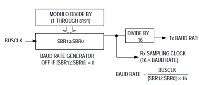 Para configurar la tasa de baudios (baud rate) para la sincronización del módulo SCI se han de configurar los registros [SBR12:SBR0] con el valor del prescaler deseado, para esto, tomar en cuenta la fórmula