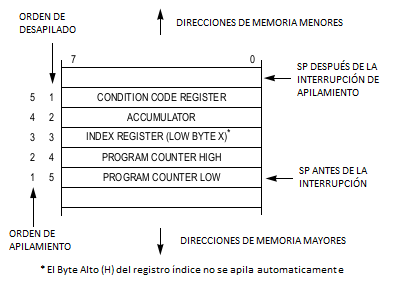 Como se muestra en el esquema, se puede observar que la interrupción deja en el stack la parte alta y baja del SP, el valor de X, el acumulador A y el código de la condición de registro. La función expuesta almacena el valor del SP en X lo que deja al sistema apuntando 5 + 1 (al hacer tsx) posiciones en relación al lugar original en el que se encontraba antes de la acción de la interrupción. Posteriormente se almacena el valor de HX en una variable temporal, y se guarda el sitio de la memoria en el cual el programa se encontraba corriendo antes de la interrupción (tasks[running].SP = tmp;).