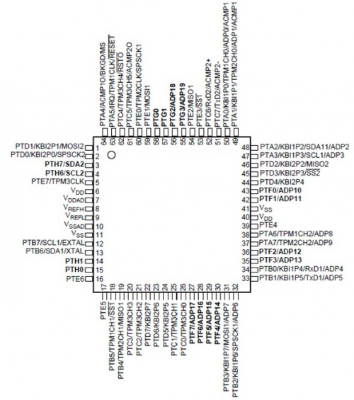 El MC9S08QE128 puede tener 80, 64,48, 44 ó 32 pines dependiendo del modelo. Este artículo se enfocará en analizar el de 64 pines debido a que es el que se usa en el Laboratorio C de la Universidad Simón Bolívar. | El MC9S08QE128 puede tener 80, 64,48, 44 ó 32 pines dependiendo del modelo. Este artículo se enfocará en analizar el de 64 pines debido a que es el que se usa en el Laboratorio C de la Universidad Simón Bolívar. | ||