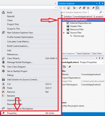 Ubicamos el nombre de nuestro proyecto, en el Explorador de Soluciones, justo debajo de Solución ‘nombredelproyecto’. Damos click derecho, y ubicamos “Properties” (Propiedades) o también, podemos acceder con la combinación Alt + Enter, teniendo seleccionado el panel de Explorador de Soluciones.