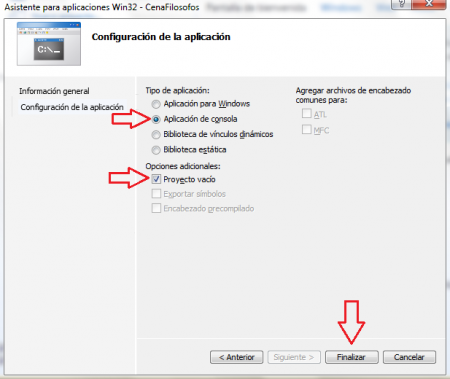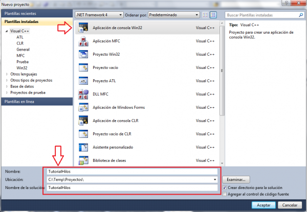 Lo siguiente que se quiere hacer, es configurar el proyecto nuevo como una Aplicación de Consola Win32. Para ello, en la ventana que emergió anteriormente, ubicamos del lado izquierdo, Templates -> Visual C++ -> Win32 Console Application (Aplicación de consola Win32). Le asignamos nombre y ubicación al proyecto (¡¡¡Tomar nota!!!), y presionamos la tecla aceptar.