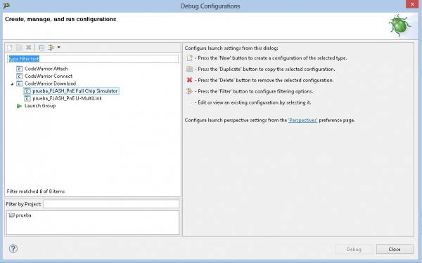 de las cuales LA PRIMERA VEZ debemos usar la opción Debugging Configurations... Luego se nos abrirá la ventana siguiente en la que deberemos utilizar la opción: CodeWarrior Download / NombredelProyecto(prueba)_FLASH_PnE_Full Chip Simulator