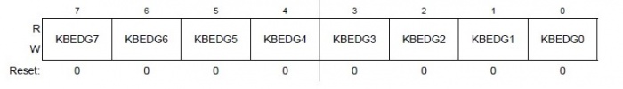- Cada uno de los bits de KBEDGn sirven a un doble propósito: Seleccionar la polaridad activa de interrupción (borde), así como la selección de un dispositivo de pull-up o pull-down si está habilitado.