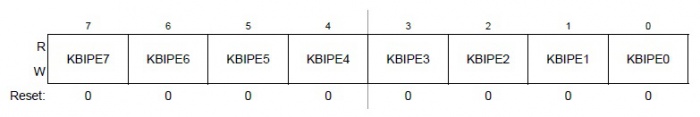 Para la habilitación de los pines a utilizar como mecanismo de interrupción se usa el registro KBIxPE. En la figura siguiente se muestra como se disponen los bits para su configuración.