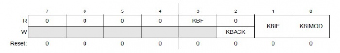 Para activar las interrupciones por teclado, se procede a configurar el registro de control para las interrupciones denominado KBIxSC(Donde la x se refiere al módulo de KBI que se quiera usar). Para la configuración se usa el siguiente esquema: